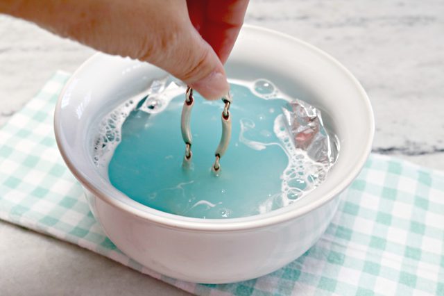 ****To clean a beaded bracelet,gently scrub with a soft cloth or soft toothbrush dipped in warm water with a small amount of mild soap. As the sketch shows, use a damp cloth to wipe away any soap and dry with a cloth. For metal spacers and tags, polish them with a soft cloth.