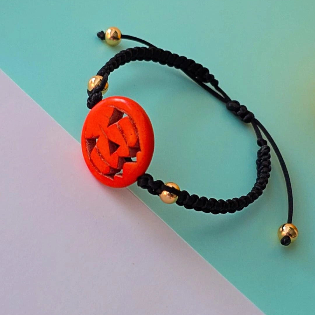 A hauntingly beautiful accessory for the spooky season! Handcrafted with smooth, durable silk thread, this bracelet features a spooky pumpkin focal bead that captures the playful spirit of Halloween. Accented with luxurious 18k gold-plated beads, it blends eerie charm with a touch of elegance. Perfect for October outfits, Halloween parties, or gifting to your favorite ghoul, this piece adds just the right amount of festive fright to your fall jewelry collection.
